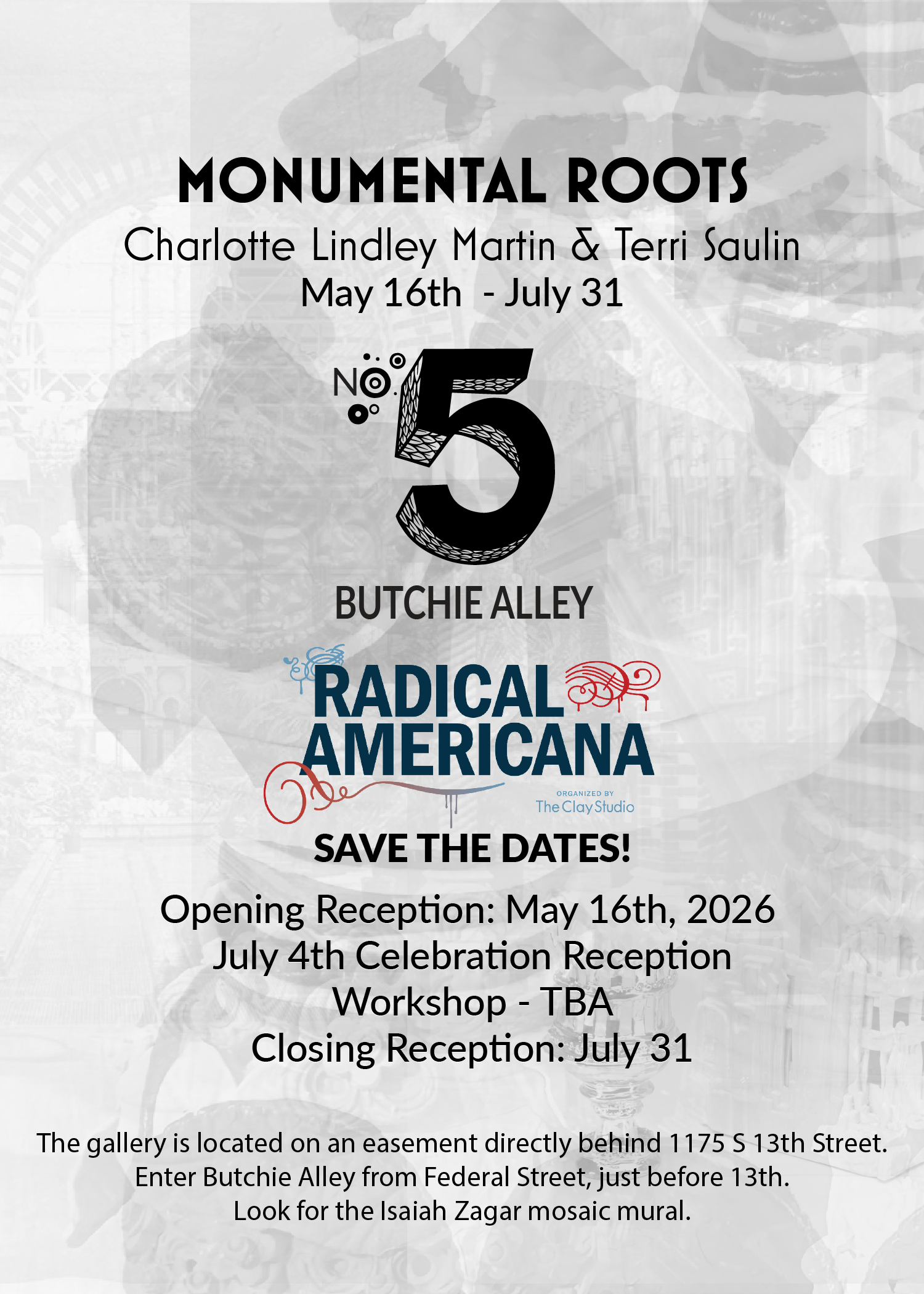 Philadelphia, PA — No. 5 Butchie Alley invites the city to step into Radical Americana: Monumental Roots, an exhibition where wild gardens, lost architectures, inherited traditions, and centuries of porcelain whisper to one another across time. In the hands of Charlotte Lindley Martin and Terri Saulin, clay becomes a place of memory and reclamation — a tender, maximalist archive of what America was, what it pretends to be, and what still blooms despite our forgetting.
